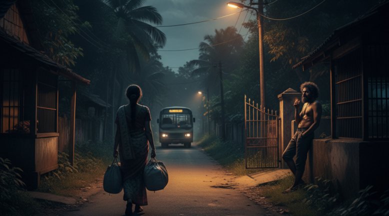 ജംഗ്ഷനിൽ ഉള്ള കടകൾ എല്ലാം പത്തു മണിക്ക് മുൻപേ അടയ്ക്കും,വീടുകളുടെ സ്ഥിതിയും മറിച്ചല്ല. സ്ട്രീറ്റ് ലൈറ്റ് ഒക്കെ കത്തിയാൽ കത്തി.അതാണ് അവളുടെ നാട്ടിലെ അവസ്ഥ.പൊതുവെ സ്ത്രീകൾ ആരും രാത്രിയിൽ ഒറ്റക്ക് യാത്ര ചെയ്യാറുമില്ല. ബാംഗ്ലൂർ നഗരത്തിലൊക്കെ അർദ്ധരാത്രിയിൽ പോലും ഒറ്റക്ക് യാത്ര ചെയ്തിട്ടുണ്ടെങ്കിലും ,ഈ വിജനമായ വഴിയിലൂടെ ഒറ്റക്ക് നടക്കുന്നത് അവൾക്കു ചിന്തിക്കാൻ കഴിയുമായിരുന്നില്ല.ബസ്സിറങ്ങി തന്റെ വീട്ടിലേക്കുള്ള പത്തുമിനിറ്റ് ദൂരം ആരെങ്കിലുമൊക്കെ ഉണ്ടാകണേ എന്നവൾ മനസ്സുരുകി പ്രാർത്ഥിച്ചു.